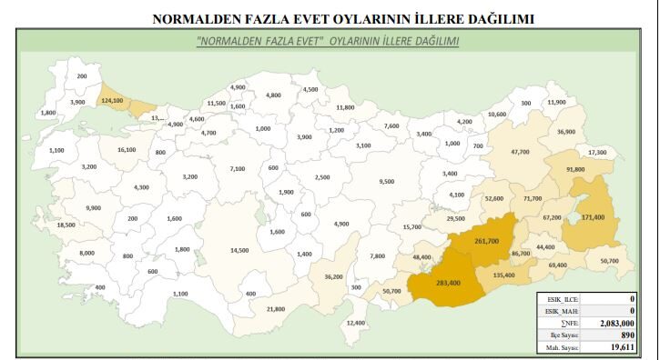 Polimetre’nin raporunda hesaplanan 2 Milyon 83 Bin “Normalden Fazla Evet Oyunun İllere Dağılımı” harita üzerinde de gösterilirken “104 İlçede 2014 ve 2019’da Belediye Başkanlığı Seçimini Kazanan Partileri, Referandumdaki gözlemci atanmamış ve toplam sandık sayılarını, Evet Oy Oranlarını göstermektedir. Tablodaki son kolon, Yapılacak Cumhurbaşkanlığı Seçiminde Etkin Sandık Güvenliği sağlanması durumunda, Cumhur İttifakı Adayı için kabul edilebilir maksimum oy oranlarını göstermektedir.” denildi.