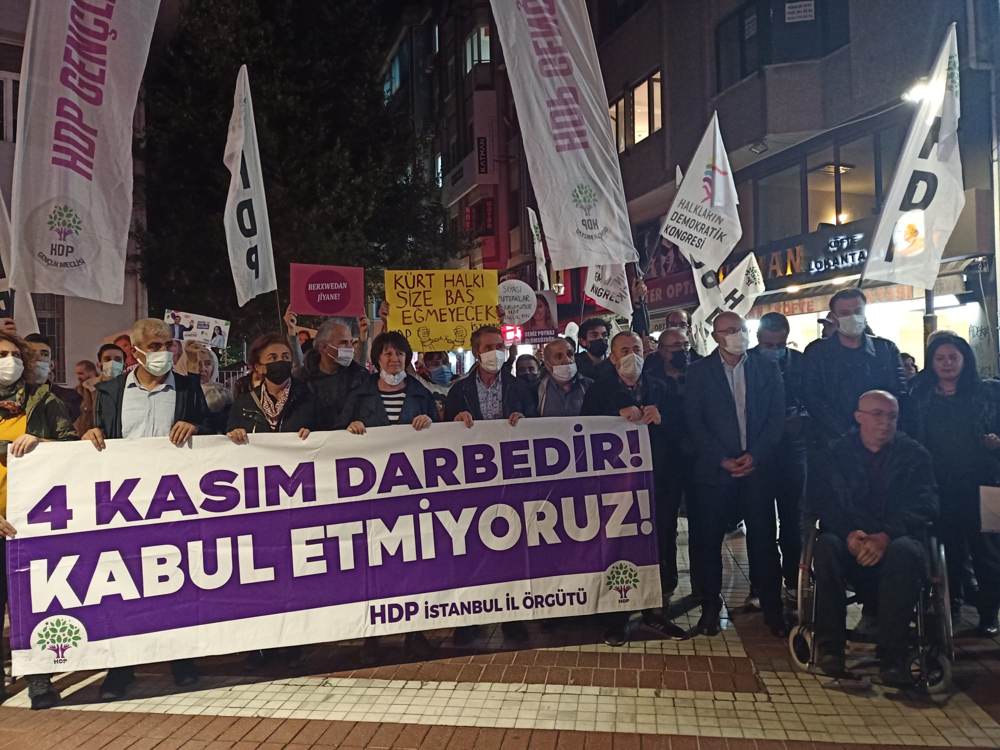 Açıklamada, “4 Kasım darbedir, kabul etmiyoruz” pankartı yer alırken sık sık “Yaşasın Kobanê direnişi” sloganı atıldı. Eyleme HDP İstanbul Milletvekili Musa Piroğlu, HDP İstanbul İl Eş başkanı Erkan Avcı, çok sayıda parti üyesi katıldı.