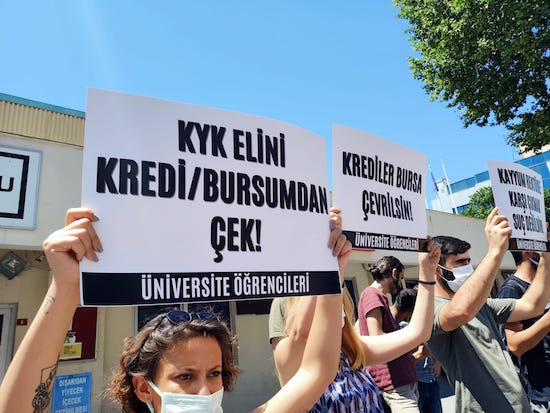 “Bugün halkın yarattığı kaynaklar üzerinden Demirören’in şirketlerine ihaleler için geri ödemesiz 750 milyon dolarlık krediler verilirken, Türkiye’nin her yerinde devlet ihalelerini alarak doğayı kar ve rant uğruna katleden Cengiz Holding’in 422 milyon liralık borcu başta olmak üzere kar rekoru kıran yüzlerce şirketin borcu silinirken; 5 milyon öğrencinin KYK borcunun silinme talebi görmezden gelindiği yetmezmiş gibi bir de öğrencilerin burs ve kredileri kesiliyor. Bir çok öğrencinin tek geçim kaynağı olan burs ve kredilerin demokratik eylem hakkını kullandığı için kesilmesi hukuksuzluktur.