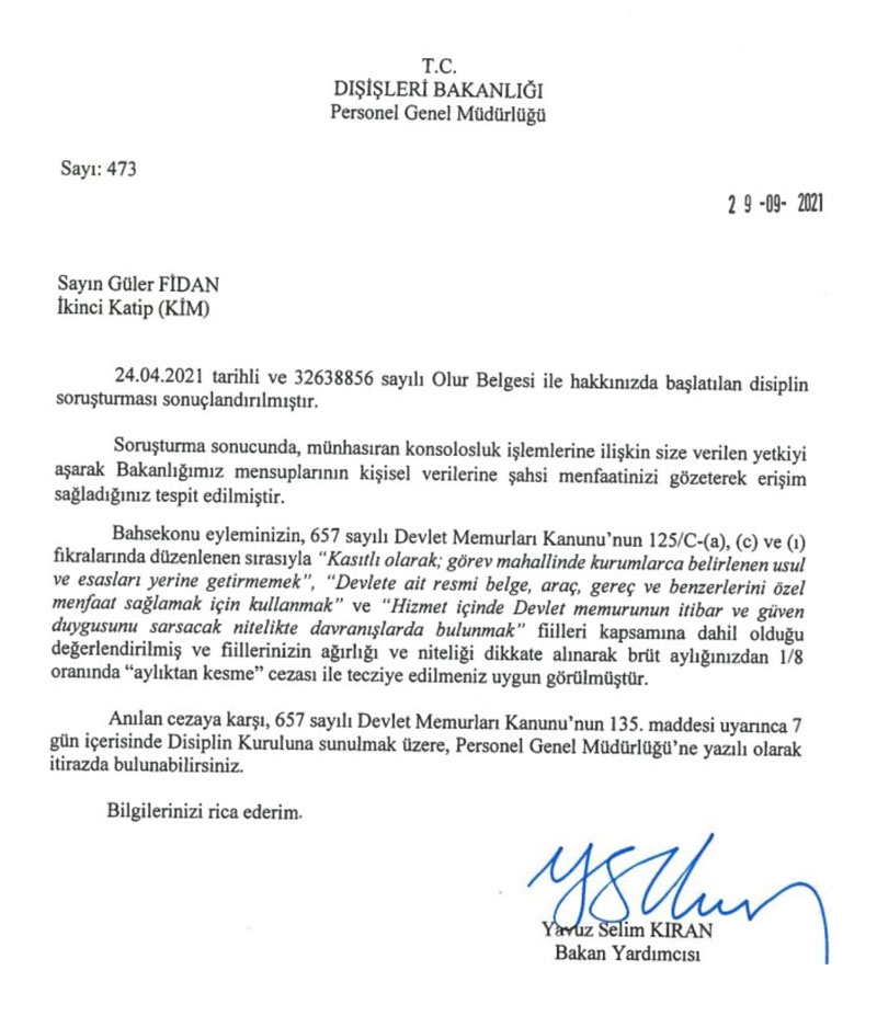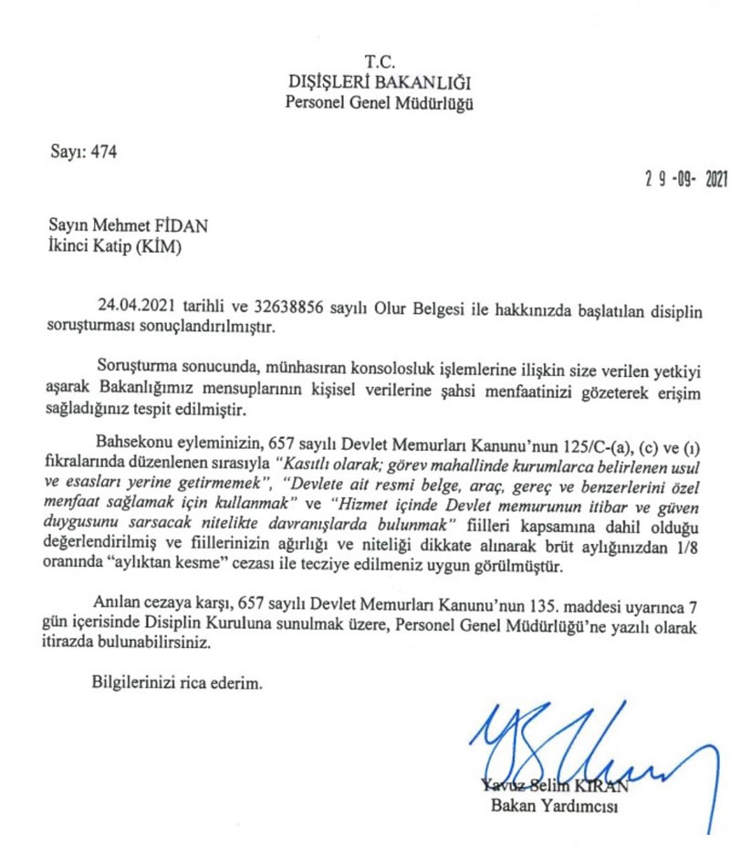 Cumhuriyet’te yer alan habere göre, bakanlığın soruşturması sonucunda Fidan çiftine ceza verildi. Bakanlığın kararında, “Fiillerinizin ağırlığı ve niteliği dikkate alınarak brüt aylığınızdan 1/8 oranında ‘aylıktan kesme’ cezası ile tecziye edilmeniz uygun görülmüştür” denildi.