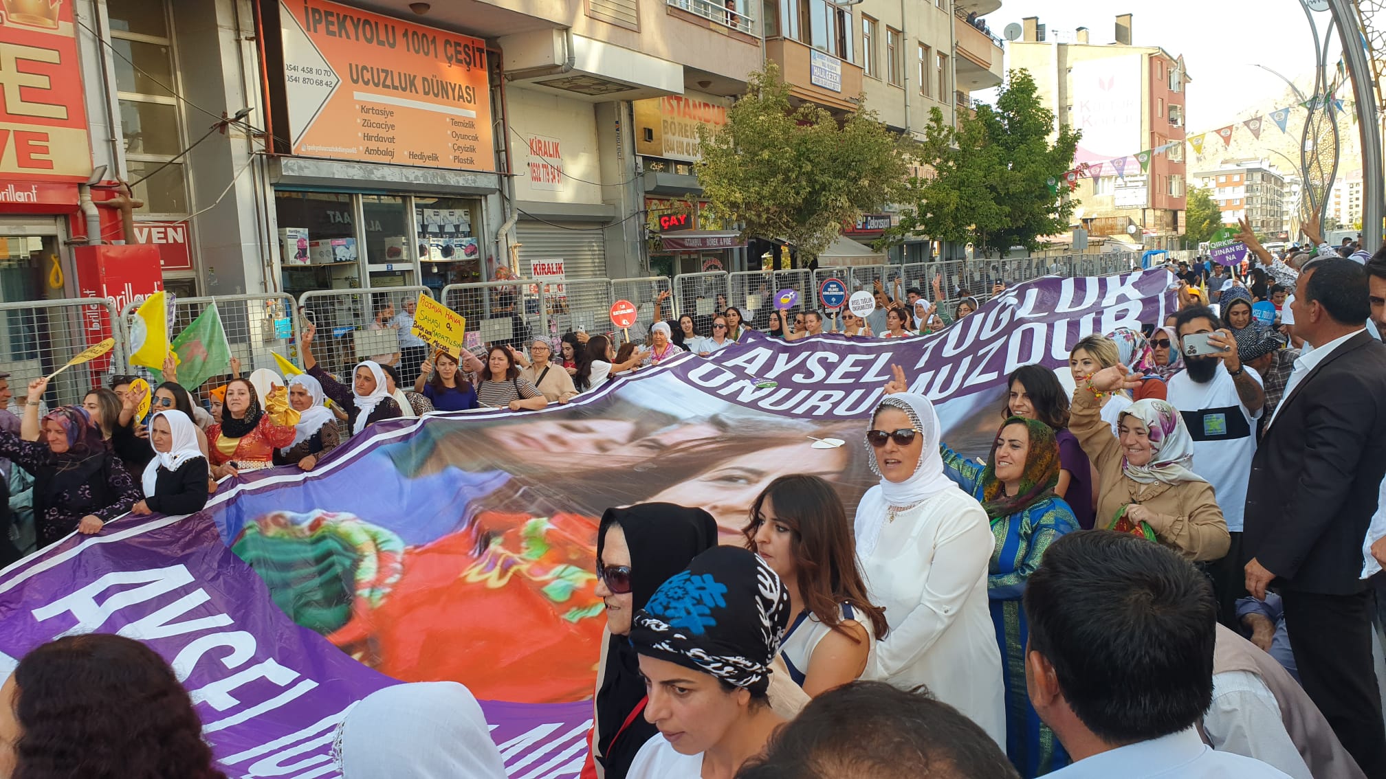 HDP İpekyolu İlçe Örgütü binasında bir araya gelen yüzlerce kişi, bir arada miting alanına gitti. Aysel Tuğluk’un dev posterini taşıyan kadınlar “Aysel Tuğluk onurumuzdur” ve “Aysel Tuğluk’a” özgürlük sloganları ve zılgıtlarla alana yürüdü.