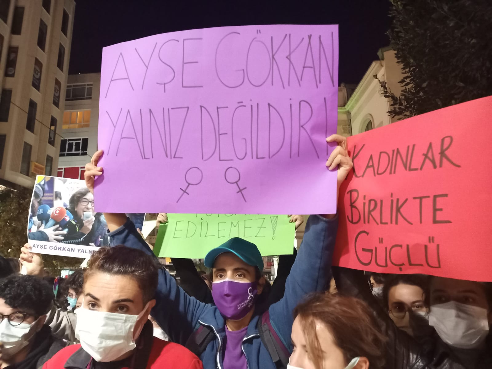 Eylemde, “Kadınlara ördüğünüz duvarları mücadelemiz yıkacak”, “Feminist mücadele tutsak edilemez” dövizleri taşınarak, “Kadın mücadelemiz yıldırılamaz” pankartları yer aldı. “Erkek adalet değil gerçek adalet” diyerek sık sık slogan atan kadınlar, Ayşe Gökhan’a verilen 30 yıl hapis cezanın erkek adaletin ve düşman hukukunun açık bir tezahürü olduğu vurguladı.