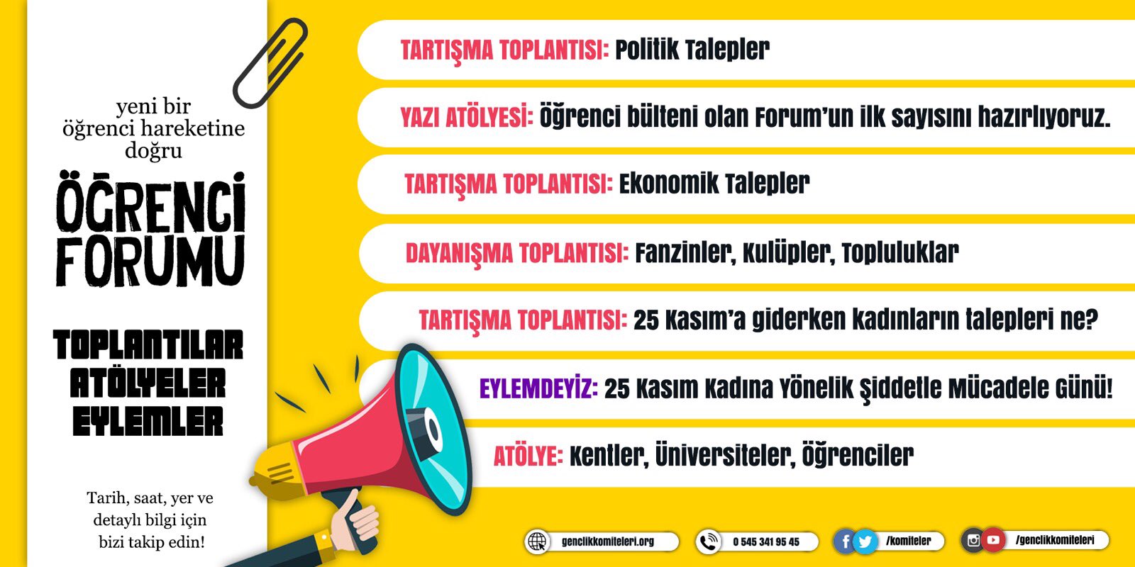 Soruları ve sorunları giderek artan gençlik, itirazlarını, deneyimlerini paylaşmak ve dayanışmayı büyütmekiçin 8 Aralık’ta düzenleyecekleri Öğrenci Forumu’nda bir araya geliyor.