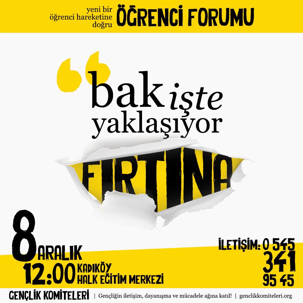 8 Aralık Pazar günü, saat 12:00’de, Kadıköy Halk Eğitim Merkezi’nde yapılacak Öğrenci Forumu’nda üniversite ve lise öğrencileri başta olmak üzere, çalışan gençlerde ekonomik, politik ve sosyal taleplerini, sorunlarını ve çözüm önerilerini tartışacak.