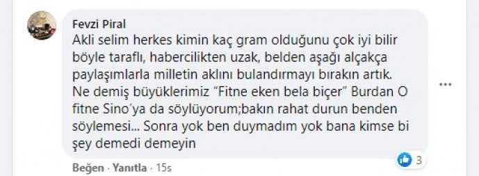 Sonrasında kendisine yönelik tehditlerin sosyal medya üzerinden devam ettiğini aktaran Aygül, “O gün tepki vermedim ama şahıs sosyal medya üzerinden de tehditlerine devam etti. Bir yorumunda bana dönük hakaret ve tehdit içeren ifadeler kullanınca kendisini telefonla aradım. ‘Fevzi bey hayırdır benimle ne probleminiz var’ diye sorunca, ‘Mevzuyu biliyorsun beni oraya getirtme’ dedi. Ben de ‘gel bekliyorum’ deyince, ‘Senin gözlerini oydururum, gebertirim seni, bizimle uğraşmanın ne olduğunu göreceksin…’ şeklinde tehditlerde bulundu” diyerek yaşadıklarını anlattı.