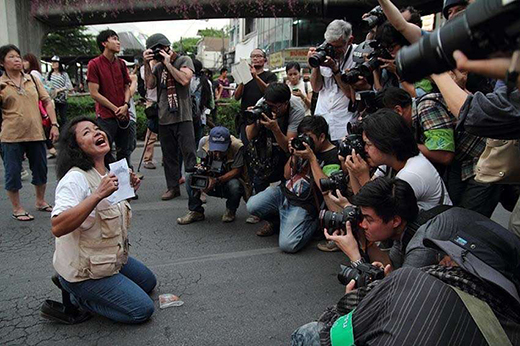 Bangkok’ta altı ay süren şiddetli çatışmaların ardından, aşırı milliyetçi grupları el altından destekleyen Tayland ordusu 21 Mayıs 2014’te seçilmiş hükümeti devirdi. Medya mensupları ve darbe karşıtı bir protestocu, 26 Mayıs 2014. ©Nick Nostitz