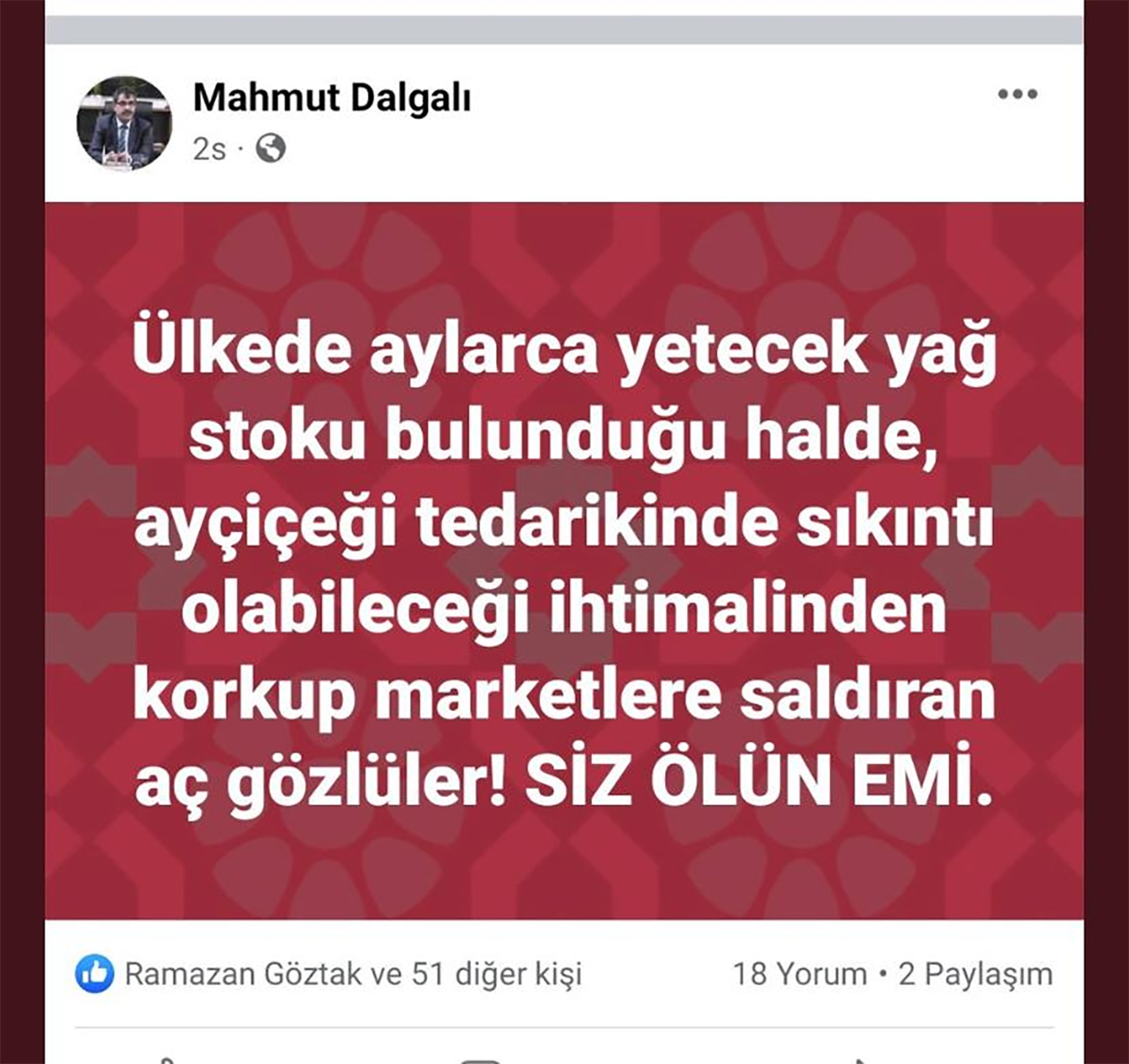 Yaşanan market kuyruğu ve izdiham görüntüleriyle ilgili Kırşehir Ticaret İl Müdürü Mahmut Dalgalı kişisel sosyal medya hesabından tepki toplayan bir paylaşım yaptı. Paylaşımda, ”Ülkede aylarca yetecek yağ stoku bulunduğu halde, ayçiçeği tedarikinde sıkıntı olabileceği ihtimalinden korkup marketlere saldıran aç gözlüler! Siz ölün emi” ifadeleri yer aldı. Gelen tepkiler üzerine Dalgalı paylaşımı sildi.