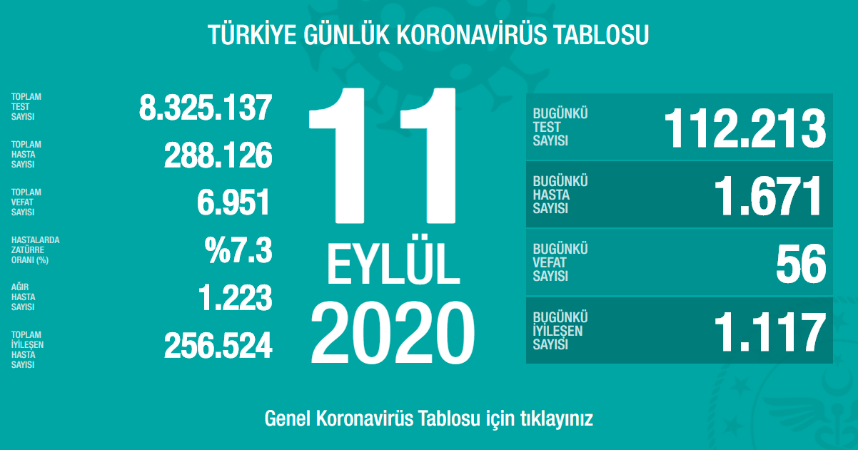 Bakan Koca’nın paylaştığı verilere göre, 10 Eylül günü 107 bin 702 olan yeni test sayısı 112 bin 213, 1512 olan yeni hasta sayısı 1671’e çıkarken 1219 olan iyileşen sayısı 1117’ye geriledi. Coronavirus nedeniyle bugün 56 kişi yaşamını yitirdi, hayatını kaybedenlerin toplam sayısı 6 bin 951‘e yükseldi.