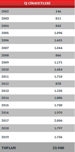 Rapora göre, 2002 yılında 146 olan iş cinayeti, 2003 yılında 811 kişiye çıkıyor. Sonraki yıllarda da artış sürüyor. 2017 yılında 2 bin 6 kişinin yaşamını yitirdiği iş cinayetleri 2019 yılında ise en az 1736 olarak kayıtlara geçti.