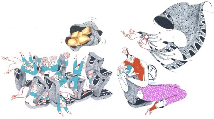 QR kodu gibi bugüne özel dijital imkânlar sayesinde, kitaba yaslı, billboardlarda izlenecek bu açık hava sergisinin daha geniş bir anlatı ve imge evrenine izleyiciyi çekebildiği ‘Bana Hikâyeni Anlat’ projesi, Keret’in yanı sıra, ‘Mutsuzluğun Keşfi’ni merak edip, yazarak anımsamaya çabalayan Bora Aşık ile, kendisine imgeleriyle yankı veren Michal Bonamo’yu da kesiştiriyor. Aşık hikâyesinde vaktiyle kimimizin de deneyimlediği seyyar dönme dolapları ‘Demirden Yaratık’a benzettiği, yarı ürkütücü paylaşımını Bonamo’ya, onun yarı figüratif, dışavurumcu, ani ve samimi desenlerinin koynuna, önlü arkalı, mukavva ve kareli bir kâğıttan yatakta sevk ediyor. Keza gerçeküstücü bu duruş, Bonamo’nun ‘Çocukluk Sokakları’nı hatırlamaya meyleden kelimelerini tasvir eden Aşık’ın desenlerinde de bizi buluyor.