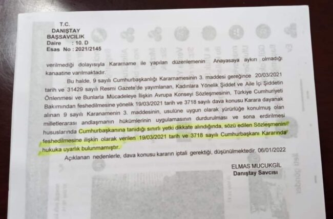 Kısa Dalga’dan Kemal Göktaş’ın haberine göre Aydın’ın Kuşadası İlçesinde yaşayan avukat Lalezar Nergiz ve 12 kadın adına açılan davada, Danıştay Savcısı görüş bildirdi. Danıştay Başsavcılığı adına Danıştay 10. Dairesi’ne gönderilen Başsavcılık görüşünde “Cumhurbaşkanı’nın sözleşmeden çekilme kararının hukuka aykırı olduğu ve iptal edilmesi gerektiği” belirtildi.