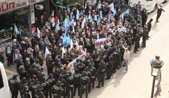 Açıklama öncesi polis, HDP binasının giriş ve çıkışlarını kapatarak, kitlenin parka gidişine izin vermedi. Açıklamanın HDP binası içinde yapılmasını istedi. Parka gitmekte direnen kitleye polis müdahale etti. Daha sonra kitle HDP binasının önünde açıklama yaptı. Eylemde “Faşizme karşı omuz omuza”, “Kurtuluş yok tek başına ya hep beraber ya hiç birimiz” ve “Biji berxwedana HDP’e” sloganı attı.