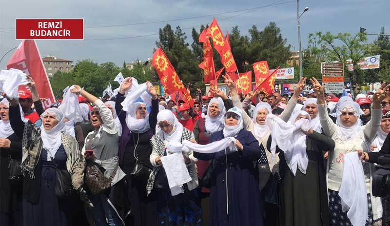 Diyarbakır’daki 1 Mayıs miting alanına annelerin açlık grevine ilişkin talepleri damgasını vurdu. Miting alanından sık sık cezaevlerinde devam eden açlık grevleri ile ilgili sloganlar atıldı. Ses sistemi başında olan polis, kitlenin attığı sloganları müziğin sesini yükselterek bastırmaya çalıştı. Sahneden sık sık tertip komitesinin belirlediği sloganlar dışında slogan atılmaması yönünde uyarılar yapıldı. Ancak tüm uyarılara rağmen alandan cezaevleri ile ilgili sloganlar atıldı.
