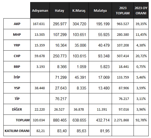 2023 seçimindeki partilerin 4 ildeki oy sayıları ve toplam oy oranları: