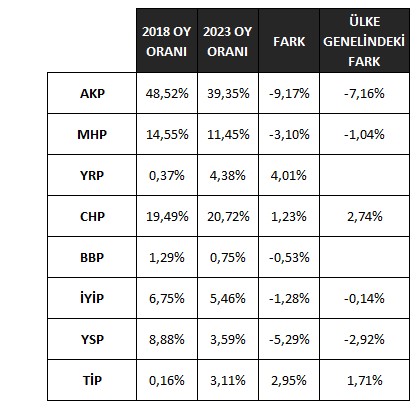 Aşağıdaki tablolarda 4 ildeki 2018 ve 2023 oyları ve oy oranlarındaki değişim gösteriliyor: