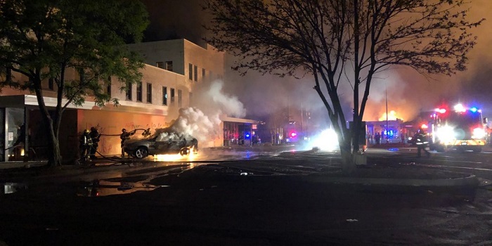 George Floyd’un öldürüldüğü kavşağın yakınındaki Minneapolis’deki polis merkezinin yakınında toplanan binlerce gösterici bazı binaları ateşe verirken polis araçlarının camlarını kırdı. Yetkililer bazı göstericilerin bir AVM’yi yağmaladığını belirtirken, protestoların merkezi olan kavşak kapatıldı.
