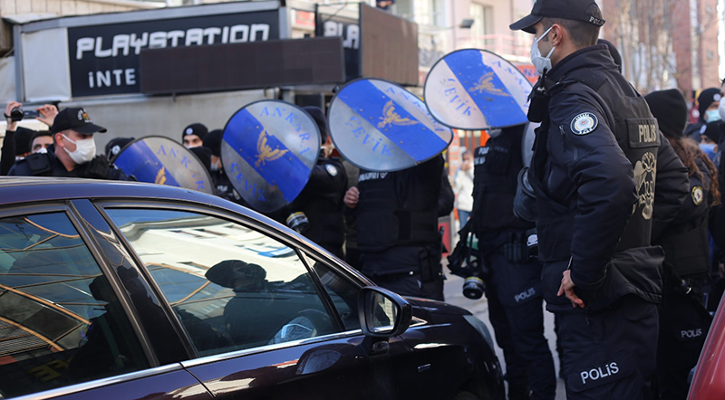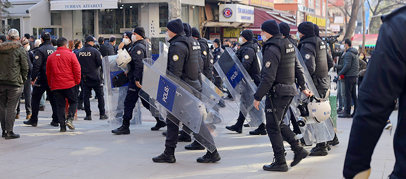 Belediye önüne “Başımız dik kazanıyoruz” dövizleriyle geçmek isteyen gruba polis, pandemi gerekçesini öne sürerek izin vermedi. Belediye önüne gitmekte kararlı olan gruba, polis Yüksel Caddesi’nde plastik mermi ve biber gazıyla müdahale etti.