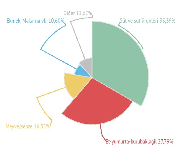 Günlük harcamalarda Şubat 2022’de en yüksek maliyet grubunu süt ve süt ürünleri grubu 48,19 liralık harcama gereksinimi ile oluşturmaktadır. Harcamalarda süt ve süt ürünlerinin payı yüzde 33,4 ile en yüksek paya sahip
