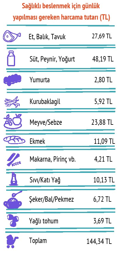 Sağlıklı beslenmek için her aile ferdinin alması gereken kalori miktarı farklılık göstermektedir. Yetişkin bir erkeğin sağlıklı bir biçimde beslenmesi için tüketmesi gereken gıdaların aylık karşılığı bin 171 liradır. Bu değer yetişkin bir kadın için bin 112, 15-18 yaş bir genç için bin 229, 4-6 yaş arası bir çocuk için 807 liradır. Sağlıklı bir biçimde beslenmenin toplam aile bütçesine maliyeti ise 4 bin 330 lira olarak tespit edilmiştir. Bu tutar söz konusu ailenin sadece gıda için yapması gereken zorunlu harcama tutardır. Eğitim, sağlık, barınma, eğlence, ısınma, ulaşım gibi giderler ile birlikte bir ailenin yapması gereken harcama tutarı 14 bin 978 liraya ulaşmaktadır.