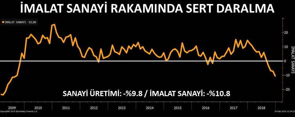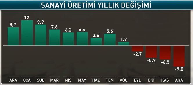 Takvim etkisinden arındırılmış sanayi üretimi Aralık 2018’de bir önceki yılın aynı ayına göre yüzde 9,8 azaldı. Endeks, yıllık ortalamada yüzde 1,8 arttı.