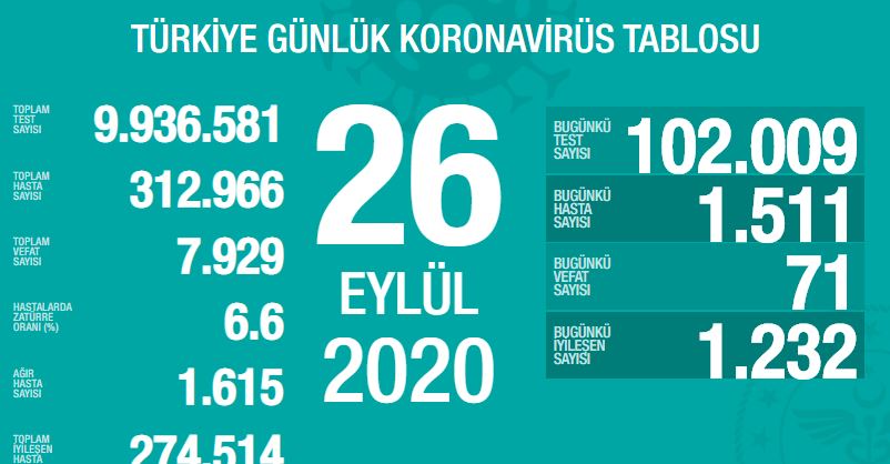 Türkiye’nin günlük Coronavirus verilerine göre bugün 71 hasta hayatını kaybetti, 1.511 yeni vaka tespit edildi, iyileşen hasta sayısı ise (Covid-19) 1.232 olarak açıklandı.