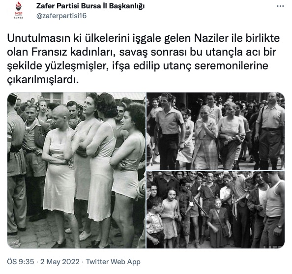 İkinci Dünya Savaşı sonrasında, Nazilerden arındırılan pek çok ülkede kadınlar Fransa’dakine benzer bir akıbete maruz kaldı. Bu ülkelerin bugün utançla, bazı yerlerde resmi özürle[xxvi] andıkları bu olayların, bunca yılın ardından Türkiye’de, hem de ülkedeki göçmenlerle ilişkili olarak gündeme gelmesi çok şey anlatıyor. Zafer Partisi Bursa İl Başkanlığı’nın paylaşımı her ne kadar “para karşılığı evlenerek vatandaşlığı satan kadınların ihaneti” ile ilgili gözükse de meselenin bundan ibaret olmadığı açık. Zafer Partisi kurulduğu günden bu yana, göçmen karşıtlığıyla, ülkedeki göçmen varlığını istila üzerinden tarif etmesiyle biliniyor.