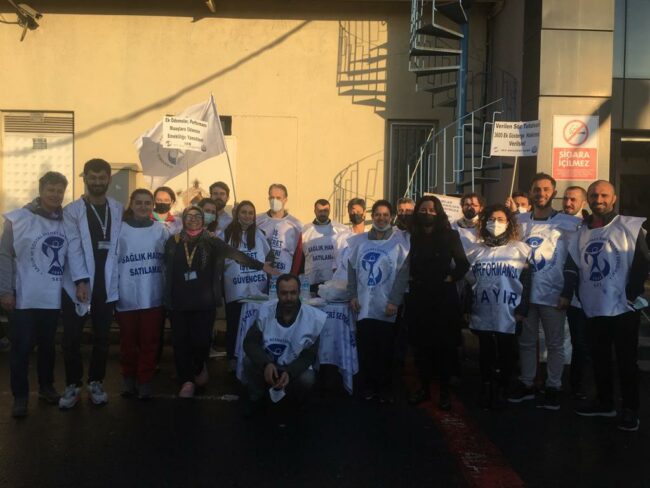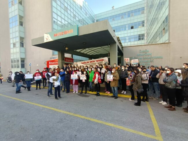 İzmir’de birçok hastanede SES ve Türk Sağlık-Sen’in çağrısıyla iş bıraktı. Ücretlerinde iyileştirme, yıpranma payı, ek gösterge gibi taleplerini dile getiren sağlık emekçileri gün boyu hizmet üretmedi.