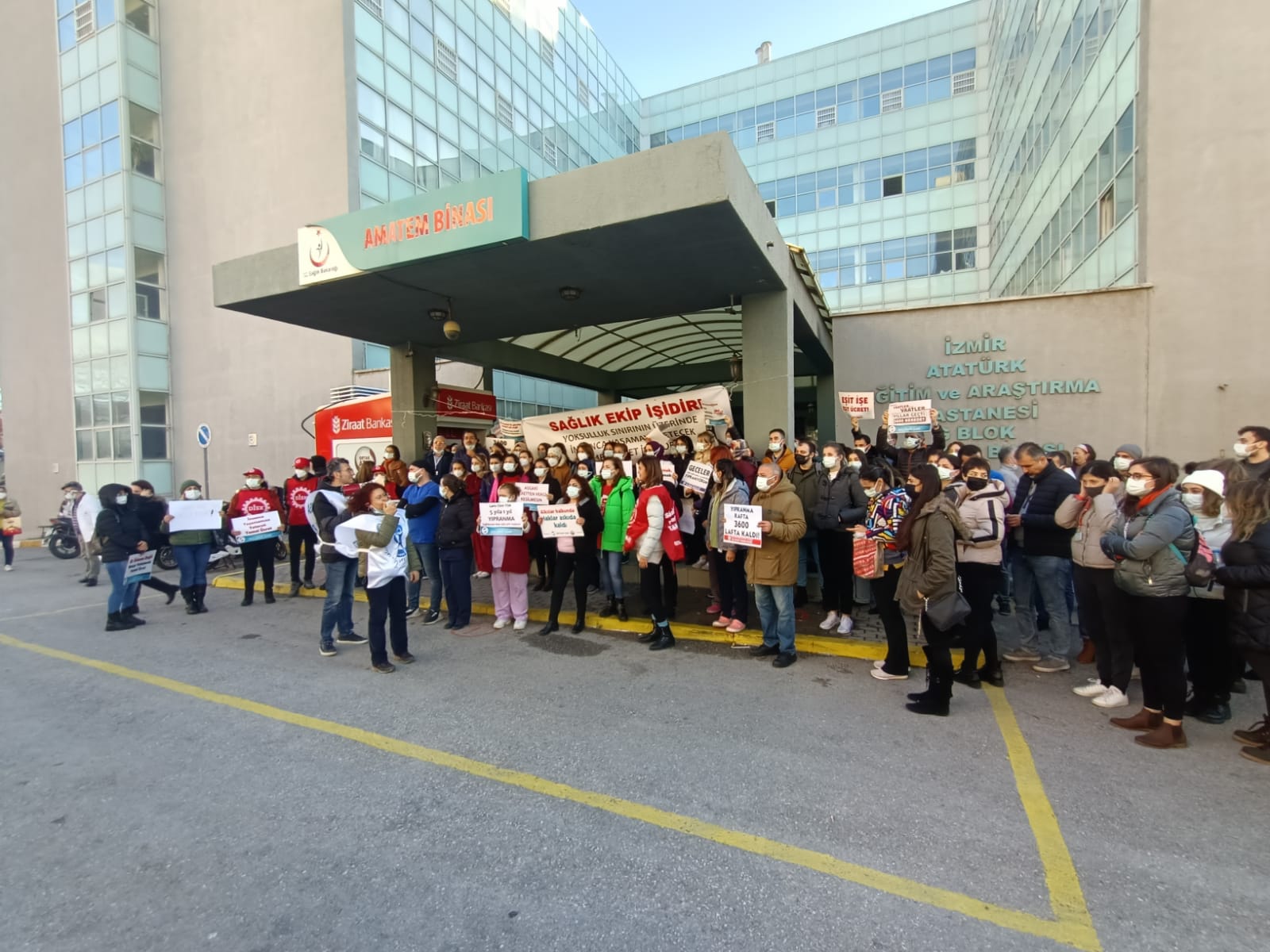 İzmir Katip Çelebi Üniversitesi Atatürk Eğitim ve Araştırma Hastanesinde sağlık emekçileri yoğun bakım ve acil servisler dışında sabahın ilk saatlerinden itibaren iş bıraktı.