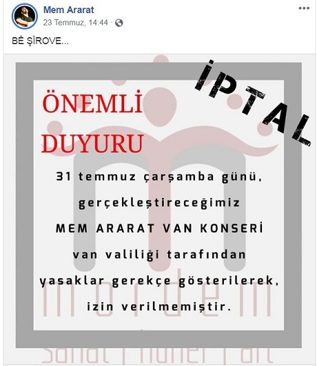 “Mem Ararat isimli sanatçının katılımıyla konser düzenleme talebi 13/07/2019 tarihinden itibaren geçerli 27/07/2019 tarihi de geçerli olmak üzere 15 gün süre ile Van ili coğrafi sınırları içerisinde, kamu kurum ve kuruşları organizesinde gerekli emniyet tedbirleri alınmak üzerine Valilik makamına bilgi verilerek yapılacak resmi kutlamalar ve diğer etkinlikler hariç olmak üzere; gerçek ve tüzel kişilerce açık alanlarda düzenlenecek her türlü yürüyüş, toplantı ve etkinlikler… Valilik makamının 12/07/2019 tarih ve 575 oluru ile alınan yasaklama kararı gereği uygun görülmemiştir.”